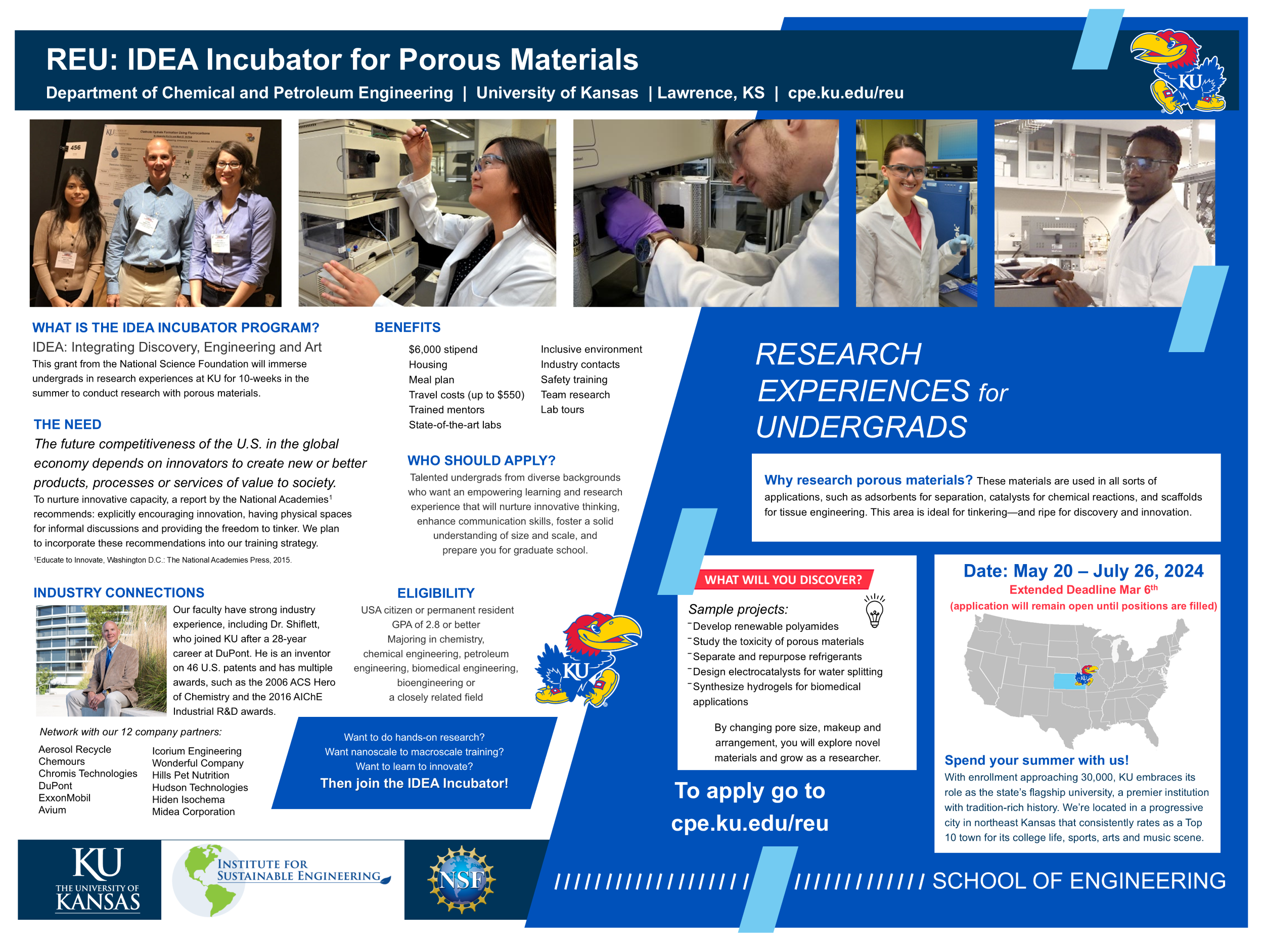 The IDEA Incubator is an exciting program that seeks to nurture innovations in porous materials by ‘Integrating Discovery, Engineering and Art’ (IDEA). We invite talented students from across the United States to participate in a 10-week research experience at the University of Kansas, conducting semi-independent research and team-based learning. To learn more about the program and details on applying, see our flyer below or visit the full website at the CPE department website at https://cpe.ku.edu/reu.