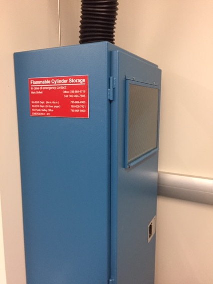 The laboratory is equipped with two ventilated gas cylinder cabinets in the event that a potentially hazardous gas cylinder must be used directly within the lab. These cabinets are connected to the building ventilation system to immediately remove gas from the lab should a cylinder unexpectedly leak.